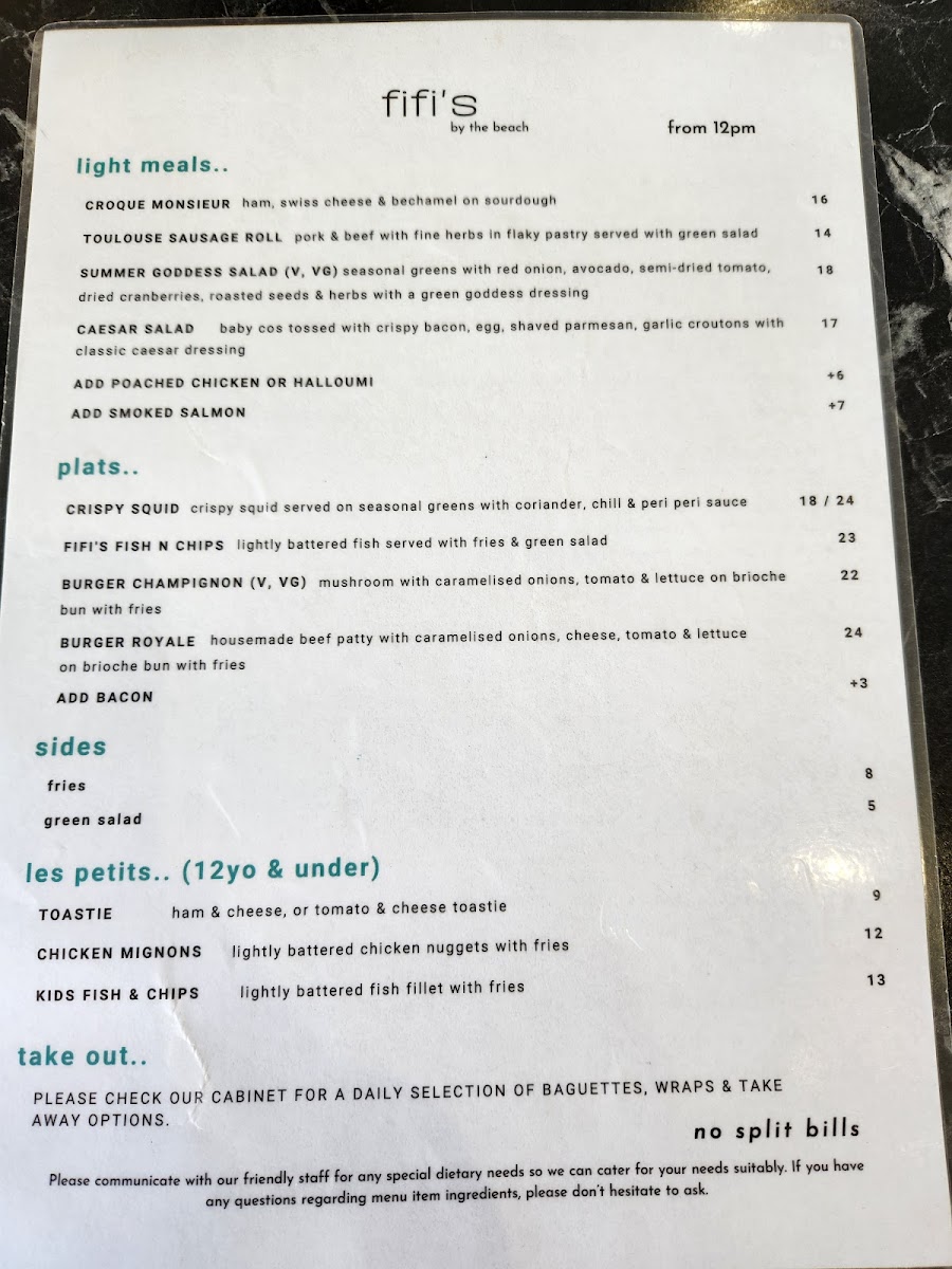 At Fifi’s By The Beach, located at 81 Esplanade in Williamstown, VIC, diners are treated to a delightful menu that balances light meals and refreshing sides, perfect for any timbre of day. Highlights include the Croque Monsieur, a crisp and cheesy French classic, and the Summer Goddess Salad, which bursts with fresh, seasonal flavors. Each item speaks to the cafe's commitment to quality and satisfaction.